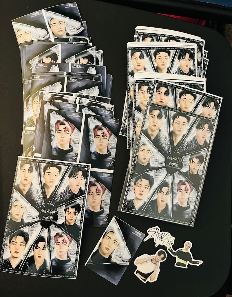Just this small moment added to the emotions that I had for the concert and I later walked out of the store filled with joy and excitement for the event to come. When I came back to the place I was staying, my mother gave me the idea to write “Stray Kids” on the green top I found in order to elegantly personalize my outfit, and on the morning of the concert, I did just that. Also on that morning, I put together images that I printed of the paintings I made and stickers of the members into small clear bags in order to give them away to the concertgoers. The images included one decently sized painting of the eight members of Stray Kids and then multiple small singular paintings of each member.