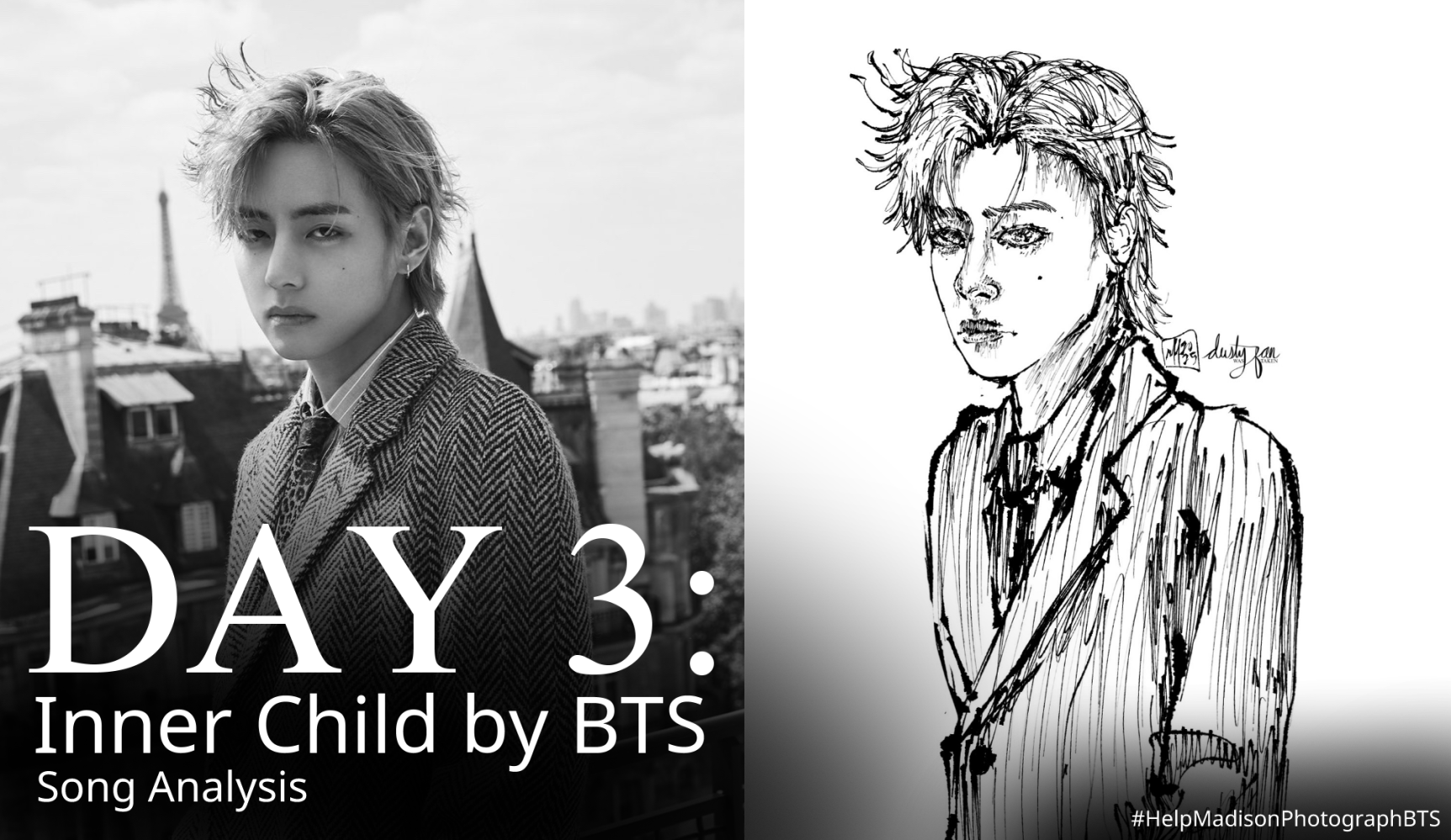 Exactly a year ago, I drew BTS member V as a part of my challenge to draw BTS every single day until they returned from the military. Now, I am embarking on a journey to analyze one of their songs connected to the member I drew a year ago while I await their upcoming concert in Tampa. The song I chose to analyze for today is Inner Child by V of BTS.