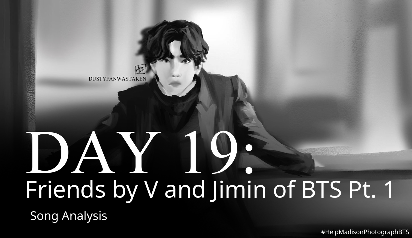 For day 19 of analyzing a song every day until BTS’ concert in Tampa, I decided to analyze the song “Friends” by V and Jimin of BTS. I hope to analyze V’s lines in this post and then, in a future post, analyze Jimin’s lines. I think this song is a beautiful testament to V and Jimin’s friendship. Due to this, I feel that the song would be a great addition to the future concert’s setlist.