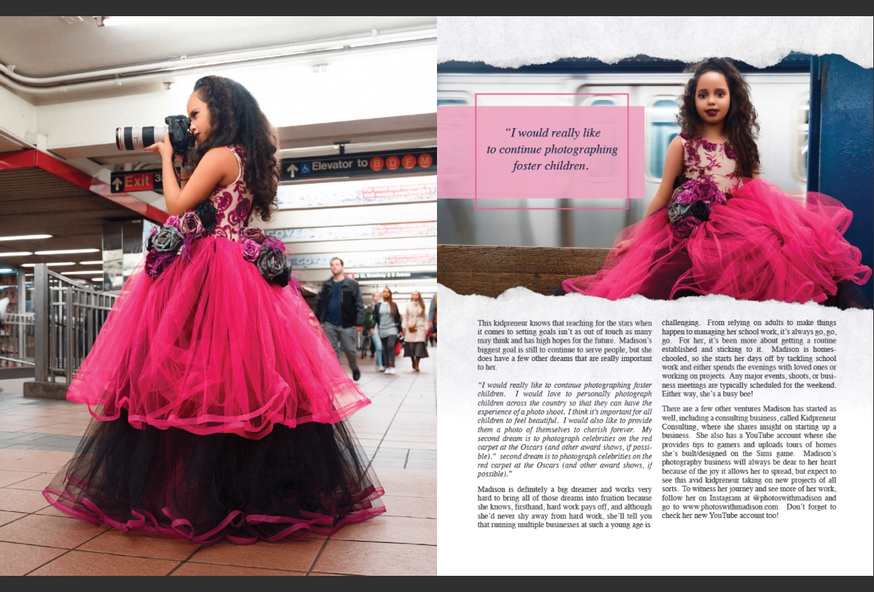Madison loves to write and was a contributing writer for, the national, “Kid Fash Magazine”. For two years, the main focus of her column, “Real Talk With Madison” was to interview celebrity children.